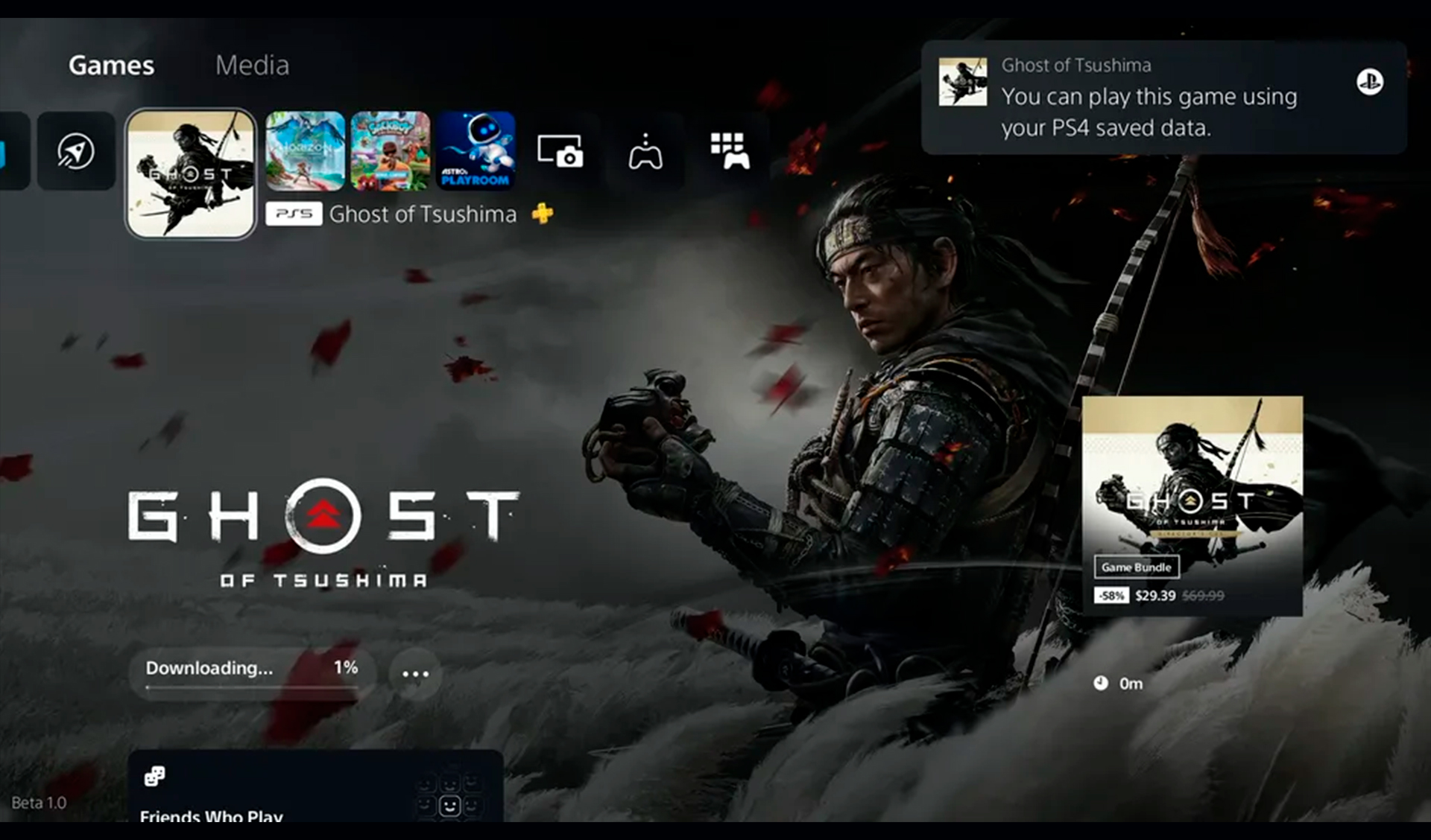 • Ao baixar ou instalar um jogo do PS4 no console PS5, aparecerá uma notificação dizendo que os dados salvos do PS4 estão disponíveis no armazenamento em nuvem da PlayStation Network (se o console PS5 ainda não tiver dados salvos do jogo). Basta selecionar a notificação para baixar os dados salvos.