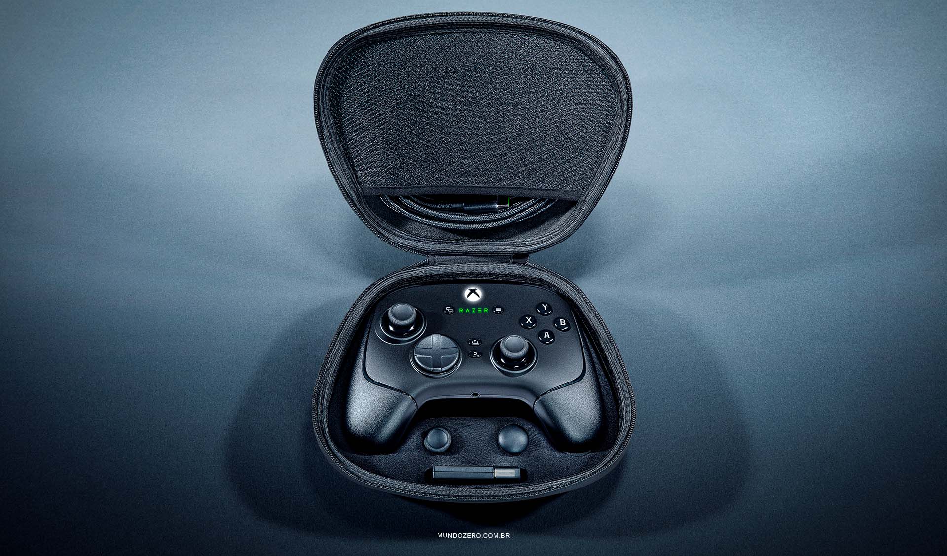 A portabilidade também foi considerada, com um estojo personalizado que acomoda o controle e seus acessórios, facilitando o transporte para torneios.