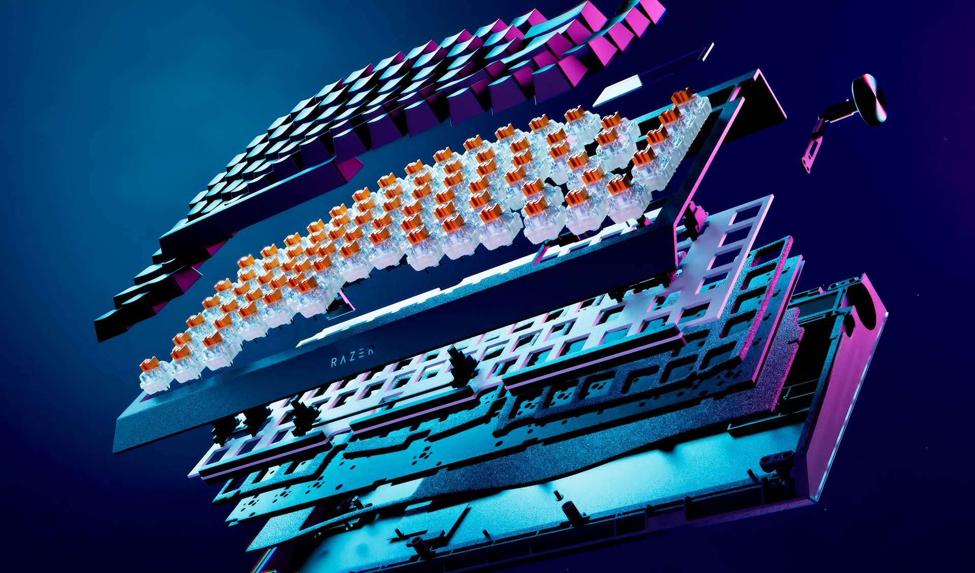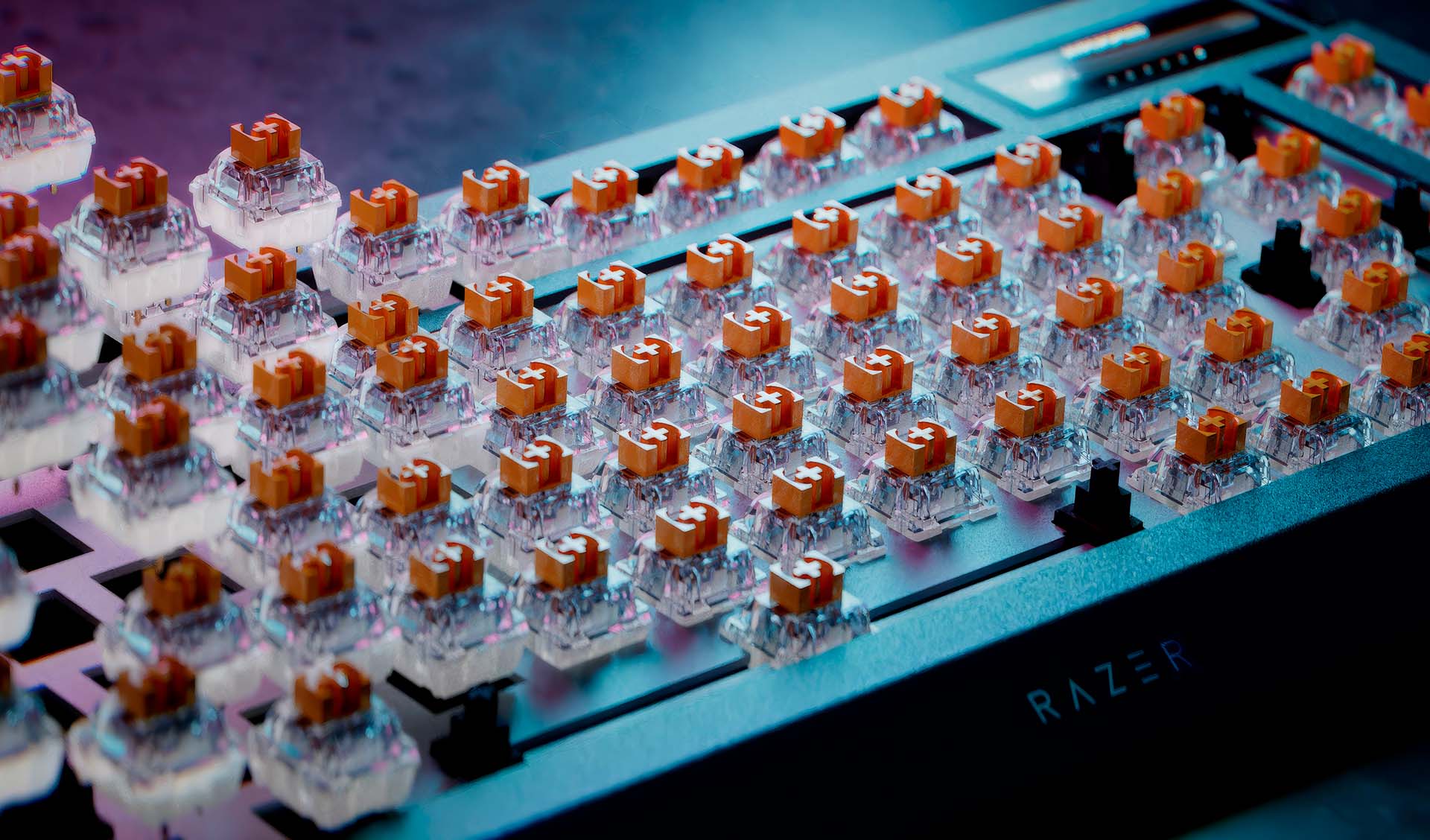 O teclado é compatível com switches mecânicos de três e cinco pinos, permitindo que os usuários personalizem a sensação de clique de cada tecla. Os switches táteis laranja Razer™ oferecem uma sensação de clique satisfatória e uma assinatura sonora que agrada aos entusiastas de teclados.