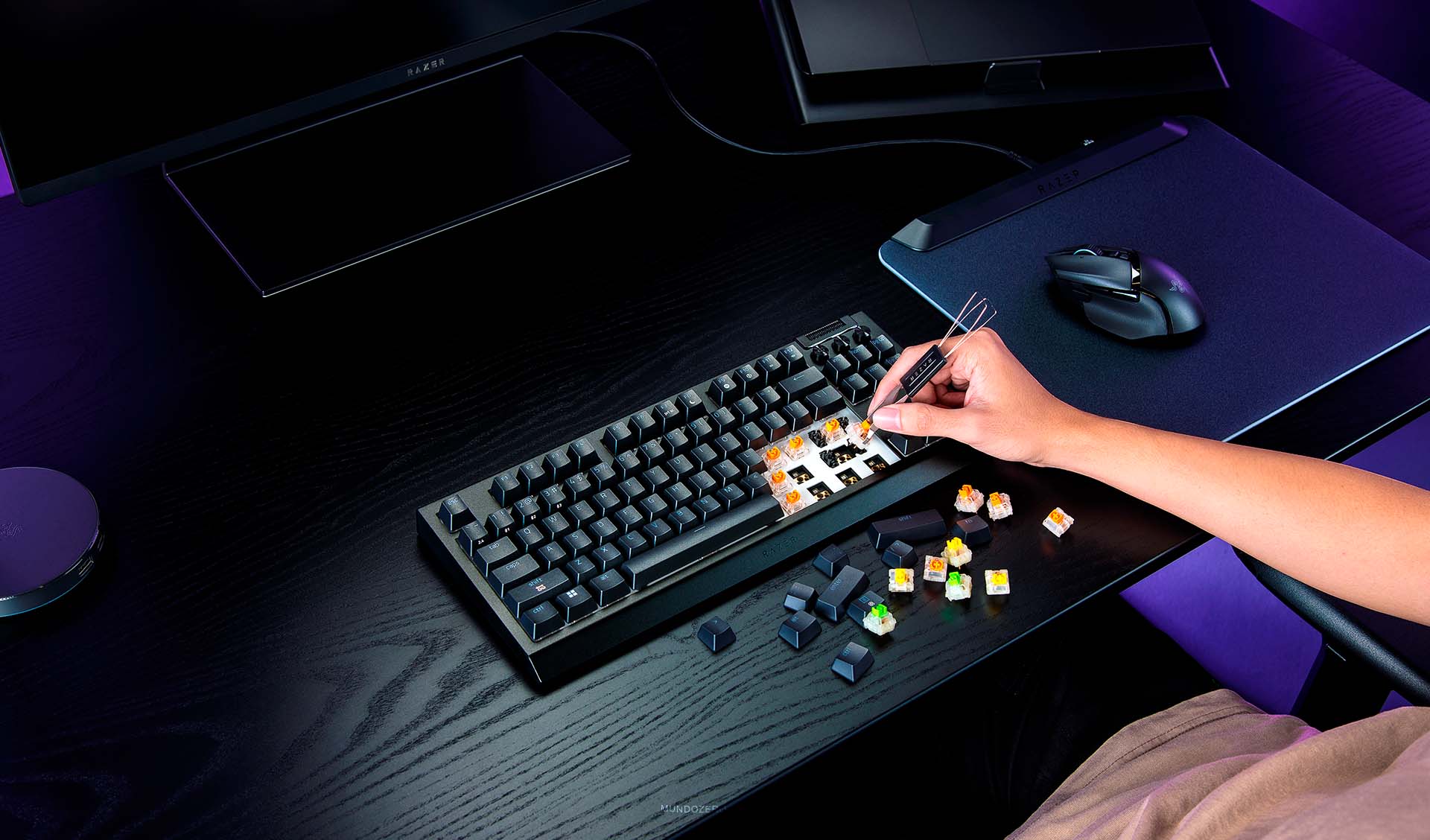 Com switches mecânicos Razer Orange Tactile de terceira geração — silenciosos e táteis — e compatibilidade com switches de 3 e 5 pinos, o usuário pode trocar, combinar e ajustar o som e a sensação de digitar ou jogar.
