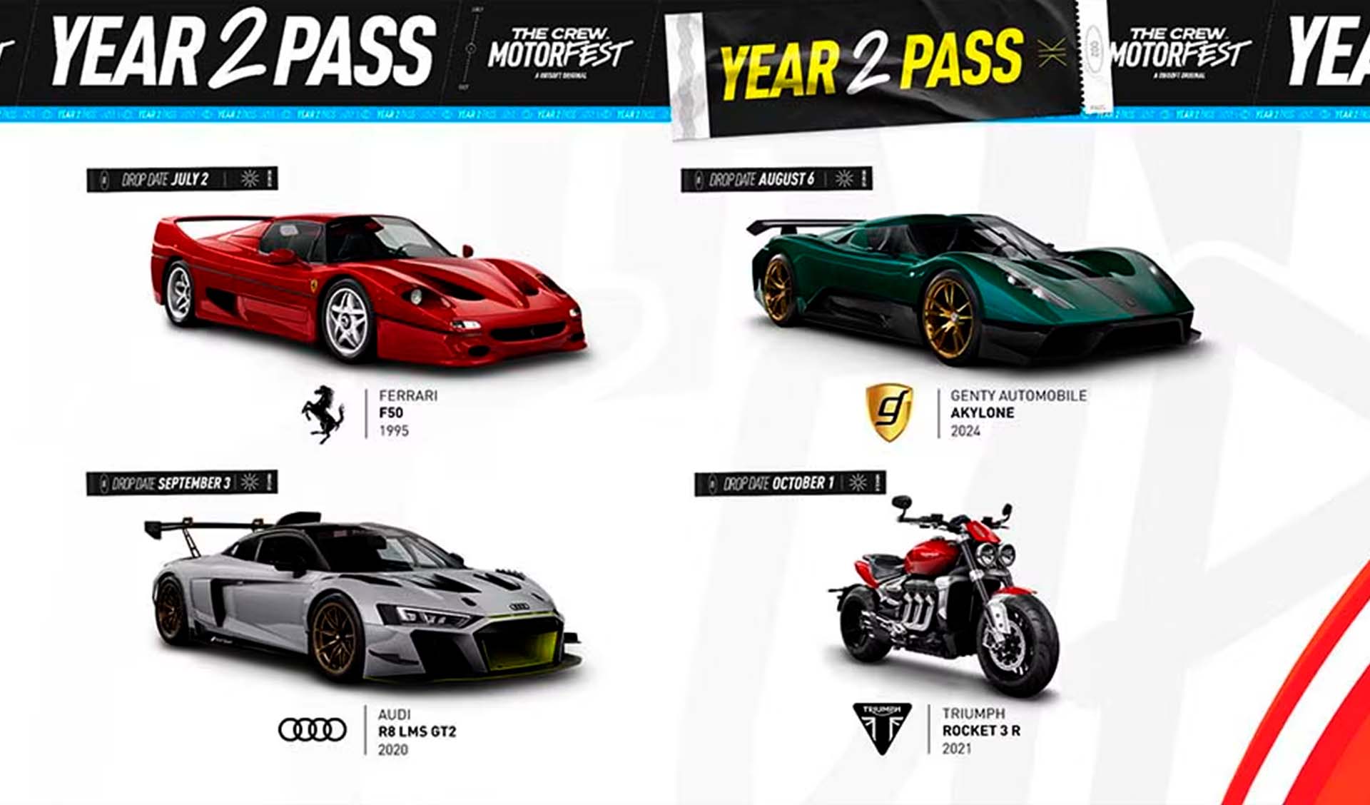 Quem investiu no Passe de Ano 2 tem acesso antecipado a quatro modelos cobiçados: a Ferrari F50, o Genty Akylone, o Audi R8 LMS GT2 e a Triumph Rocket 3 R, liberados de forma escalonada até outubro. Um incentivo extra para quem quer estar sempre um passo (ou marcha) à frente.